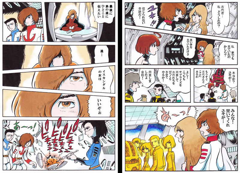 New parody comics by Keiichi Tanaka, based on scenes in Chapter 7. At left, Niimi reacts negatively to Mamoru Kodai’s last message. At right, Yuki returns to life and the crew plans a special surprise to welcome her back.