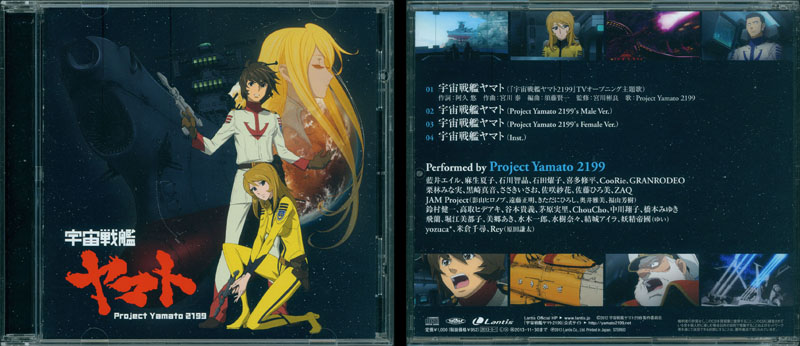 Topping out as a 30-member chorus, Project Yamato 2199 delivered a knockout punch when their rendition of the Yamato theme was first heard on TV as the opening title of Episode 2. (Episode 1 opened without a song.) The disc contains four versions; full chorus, male only, female only, and instrumental. A long list of music stores in Japan participated in a giveaway program in which postcards were handed out with each CD purchase until supplies ran out.