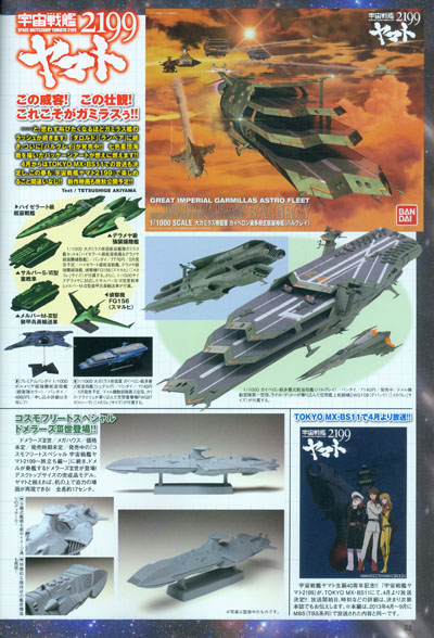 Yamato 2199 products got their usual 2-page spread in the April issue of Hyper Hobby with the new Balgray carrier (released in February) and the upcoming Domelus III Cosmo Fleet Special miniature prominently featured. Space was also given to the 1/500 Yamato expansion parts (June), the fast-approaching Mecha Collection mini-kits (April), and the 1/12 Analyzer model (June), along with Alpha-Omega’s 1/8 Kaoru Niimi figure (July).