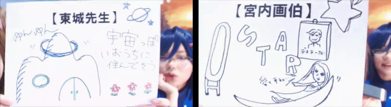 In the drawing segment, the challenge was to envision Queen Starsha’s bedroom. Toujo showed it from the outside with a Saturn-like ring around the building, but Momoko took us inside where Starsha rocks on a banana-shaped bed with a portrait of Dessler hanging nearby.