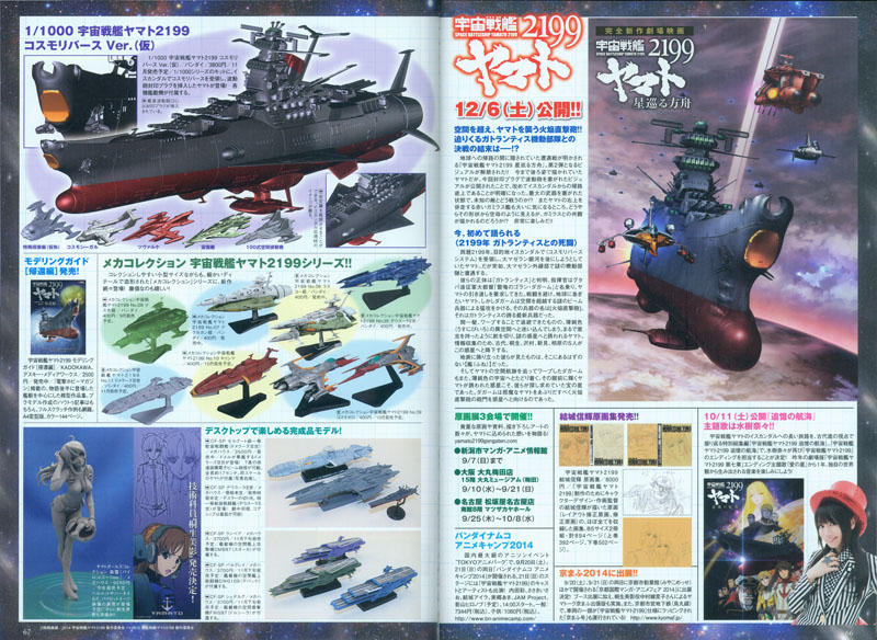 This issue’s 2-page spread was a roundup of August events and announcements. At top right is the new key art and description for Ark of the Stars with music and book news below it. At top left is the CAD image for the 1/1000 “Cosmo Reverse” Yamato model kit and its support vehicles, due out in late December. Below that are the current and upcoming Mecha Collection mini-kits. Megahouse products occupy the bottom left.