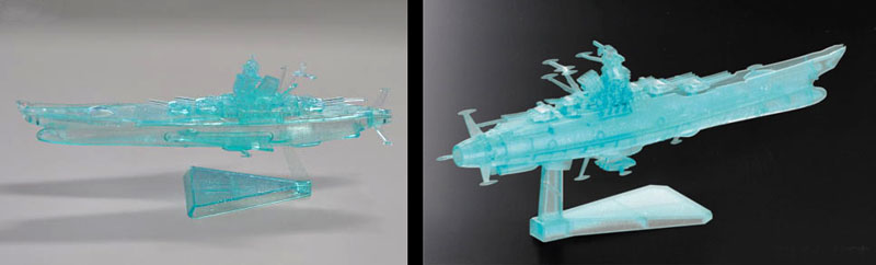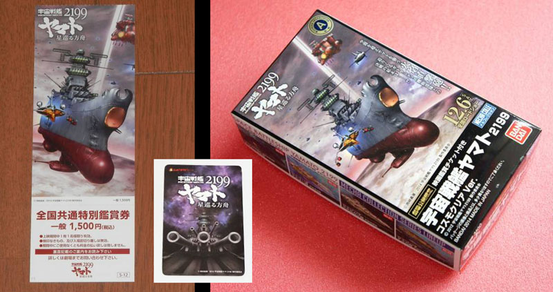 Sold in a commemorative box, the model is a reissue of the first Yamato 2199 Mecha Collection kit cast in translucent “Cosmo Clear” plastic. A “movie picture” card with a list of participating theaters was also included (top picture, inset).