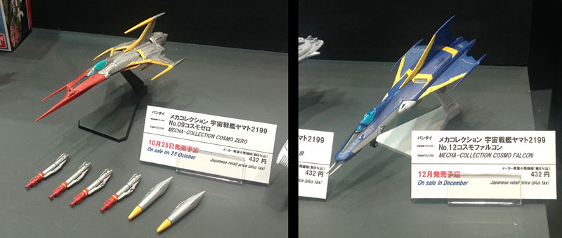 Sitting nearby were Mecha Collections kits 9 and 12, Cosmo Zero and Cosmo Falcon, to be released October and December respectively. (10 and 11 will be Kirishima and Domelaze III, coming in October and November.)
