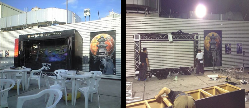 When the 2199 Art Exhibition first opened at Seibu Department store in Ikebukuro Tokyo on April 22 (revisit it here), an outdoor café called Yamato 2199 Beer Terrace of the Starry Sky also opened with custom Yamato décor – such as a case full of model kits flying into battle. When it closed on September 30, fans stayed to the very end as the Twitter photo above right attests.
