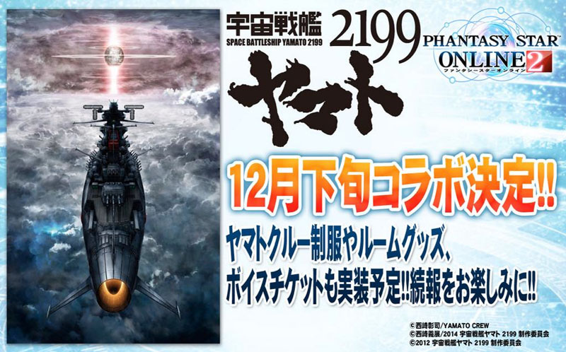 PSO2 is a popular multiplayer RPG game released by Sega, and it was announced in early September that a Yamato 2199 collaboration would go into action late December, which most likely means Yamato-derived elements such as costumes and props could appear in the game. More news as it happens.