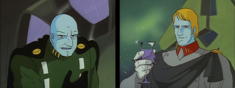 On the Galman homeworld, Dessler’s [Desslok’s] war council meeting starts off with a glowing report of the victories on the western and southern fronts. Chief of Staff Keeling credits Dessler for these victories, but the Emperor says the glory should go to the men who fought the battles. He commends Histenbarger [Smellon] and Kuroten, who are in command of the western and southern forces, respectively.