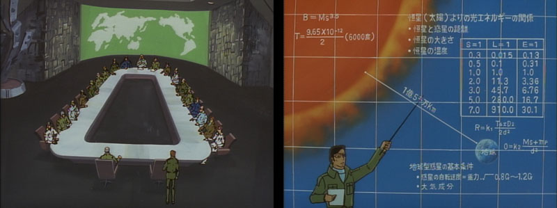 Commander Todo’s new emigration office doesn’t waste any time getting organized. A meeting is held featuring a discussion about what comprises a suitable planet. There are six criteria “new Earth” must meet: 1) suitable atmosphere, 2) abundant water, food, and minerals, 3) be within a 15,000 light year range to allow safe emigration, 4) moderate temperatures, 5) orbit a Sol-type star, and 6) must be uninhabited by other cultures. If any one of these criteria is not met, the planet will be rejected.
