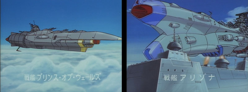 The Arizona (above right) is named after a US “super-dreadnought” class battleship stationed at Pearl Harbor. It was sunk during the Japanese attack on Pearl Harbor on December 7th, 1941. The wreck was unable to be salvaged, so today it is a national memorial park. Despite its very brief screen time, Yamato III‘s Arizona has been a fan favorite since it first appeared, ranking third behind Yamato and Andromeda. It should come as no surprise that it was designed by Yutaka Izubuchi, and had another brief cameo in the 2012 Director’s Cut of Yamato Resurrection.