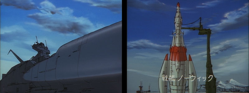 The fourth battleship is the Novik (above right), named for a line of Russian vessels; the Imperial Russian Navy deployed at least three vessels with this name (a corvette, a cruiser, and a destroyer) from 1856 to 1941. The rendering of the name in Japanese katakana also generates Norwick as a possible translation, and there is a history of vessels named Norwich in both the British Royal Navy and the US Navy, but official Yamato III materials declare the ship to be Russian, so Novik gets the vote. One possible root word in Russian for Novik is New, but the ship looks more like a 60s era rocket, complete with a gantry launch pad. Its destination is said (in support materials) to be Vega, Casseopia, Ypsilon and Procyon.
