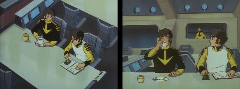 Wildstar announces that the crew has been invited to the reception party. Anyone not assigned to work duties is welcome. In Yamato III, engine room workers Akagi and Tokugawa are thrilled to hear about the party, in part because Akagi points out that a place this cold is likely to have a lot of liquor on hand. (Space Vodka, one would assume.) Their Star Blazers equivalents, Ace and Orion, are looking forward to the feast itself, with no mention of alcoholic drinks.