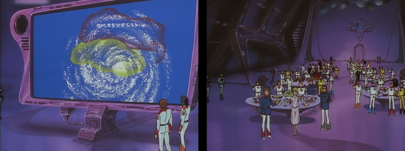 Story note: In one shot, the Bolar alphabet is seen on the galaxy map, a dense string of letters indicating their territory. The next view is a closeup with Japanese text. Curiously, whereas the Japanese map labels Galman’s territory, the native-language map does not.