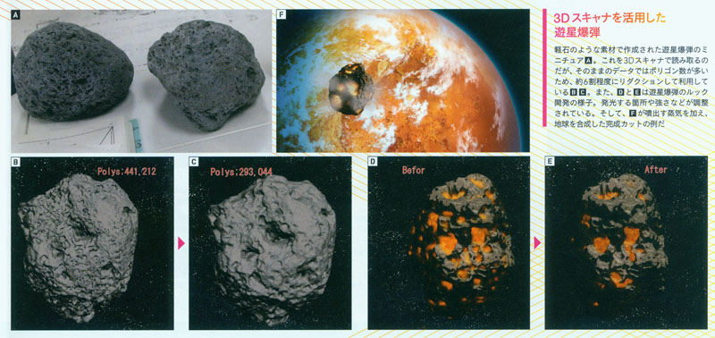 A miniature of the planet bomb [A] was created with material like a pumice stone. After reading it with a 3D scanner, there is a large number of polygons in the data [B], so they are reduced by about 60% [C]. Additionally, [D] and [E] show states of development for the look of a planet bomb. The location and strength of the glowing light is adjusted, then a steam eruption is added in this example of a completed scene with a synthesized Earth [F].