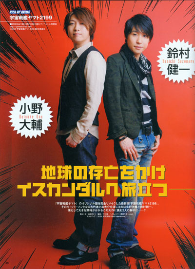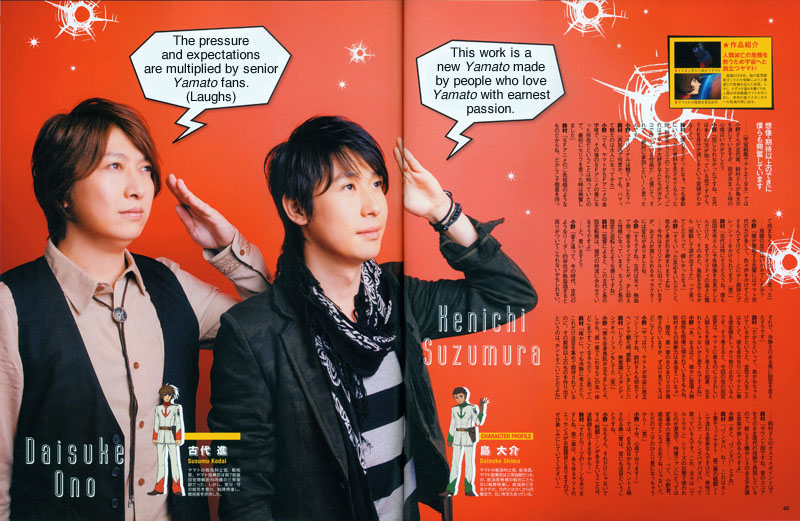 The original Space Battleship Yamato gets a complete remake, Yamato 2199. Daisuke Ono and Kenichi Suzumura become the key people, playing Susumu Kodai and Shima Daisuke. What are the feelings of these two as they take on the high expectations of this epic challenge…?