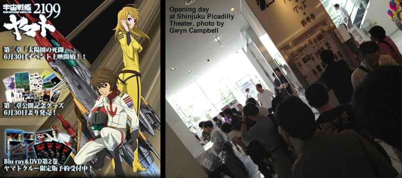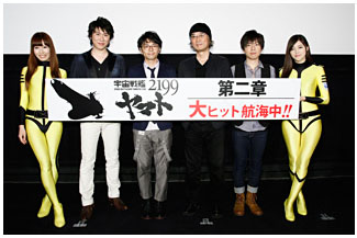 Yamato 2199: Desperate Battle in the Heliosphere is the title of the second film, collecting episodes 3-6 in a single package. The rest of the series is scheduled to follow this format for a total of five more films. A few days before the premiere, some theaters announced that advance tickets had completely sold out. This was particularly true of the Shinjuku Picadilly in Tokyo (a name that should be familiar to Yamatour readers), which once again hosted an opening-day talk show. This time, Director Yutaka Izubuchi was joined by the voice actors for Nanbu [Dash], Ota [Eager] and Aihara [Homer] to introduce the film.