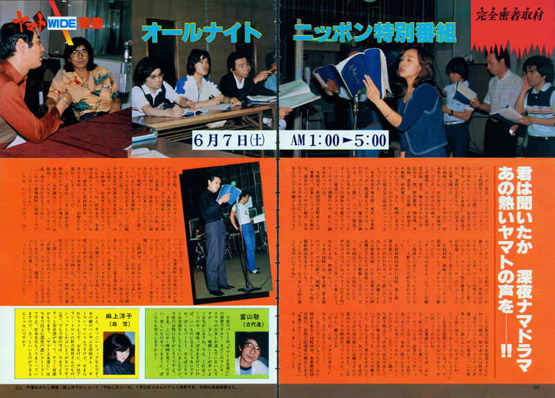 After the familiar All Night Nippon opening theme, the broadcast from Shinjuku begins. Personality Kinjiro Hata and Producer Nishizaki are on standby in the studio. Leiji Matsumoto, who arrived ten minutes before the start, is also waiting for his turn. Hiroshi Miyagawa and singers Akira Fuse and Isao Sasaki have also arrived. All the Yamato stars have gathered at Nippon Broadcasting.