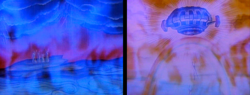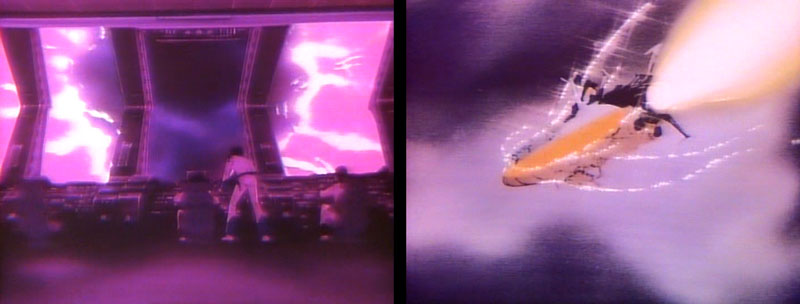 Here is another example of “Scanimation” at work. To give the neutrino beam a unique look in this sequence, finished animation was shot and scanned into a video processor (hence the name “scanimation”) where the color values could be manipulated. There was nothing special about this technology in 1983; every color TV had similar capability. What was new about it was the application to 35mm film, which meant the real breakthrough was getting an image off a film negative, enhancing it, and then outputting it back onto film. This is the part that didn’t always go to plan, as we’ll see later on.
