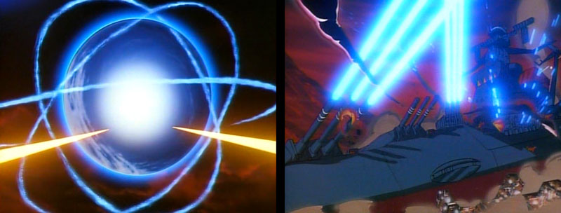 Prince de Zahl reports his defeat to his father. Emperor Lugal cuts him off and orders the Neutrino screen activated. Generators hum to life and form a barrier around the fortress. De Zahl cannot stop his incoming ship in time and is destroyed by the screen — his punishment for another failure. Yamato follows close behind. Sanada recognizes the energy barrier as a neutrino shield and warns that the shield “could melt the ship.” As Yamato does a quick 180 and zooms away, building up to light speed, Lugal orders a neutrino beam fired at the ship.