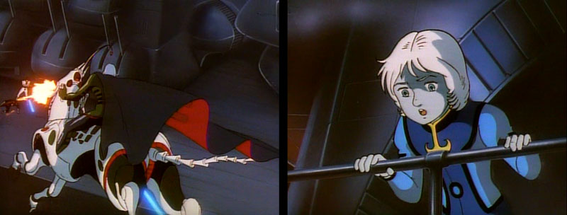 The mechanical steeds have great leaping power, allowing them to storm over the deck of the battleship. Kodai, Shima, and dozens of rank-and-file crew take positions on the deck to fend off the attack with grenades and cosmo guns. Most of the attackers charge forward blindly and are easily cut down, but Lugal displays much more agility, leaping around on his mount and cutting down Yamato defenders with ease. From inside the ship, the Dengilian boy stares in amazement at Lugal.