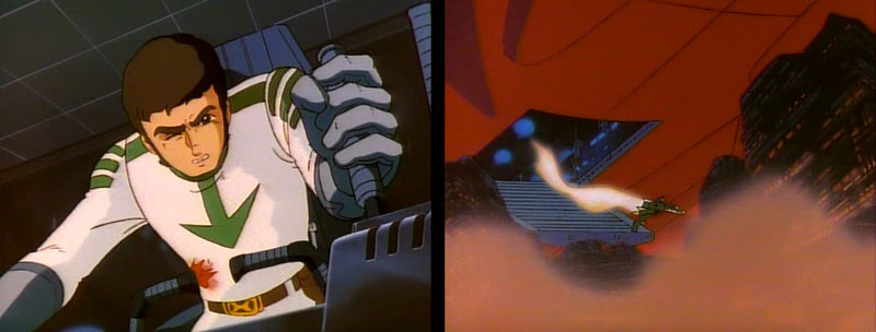 Kodai launches his zero from the catapult and begins clearing invaders off his deck. Shima arrives on the bridge in great pain, but he continues to hide his wound from the others. The hangar hatch is unable to open all the way due to Yamato‘s position on the ground. Using a combination of the rocket anchor, the sub engines, and ventral “compressed air valves” Shima manages to get the aft section of Yamato to lift enough for the hatch to open. The effort costs Shima dearly, and he winces in pain with every movement. He accomplishes his task though, and the Cosmo Tigers quickly launch.