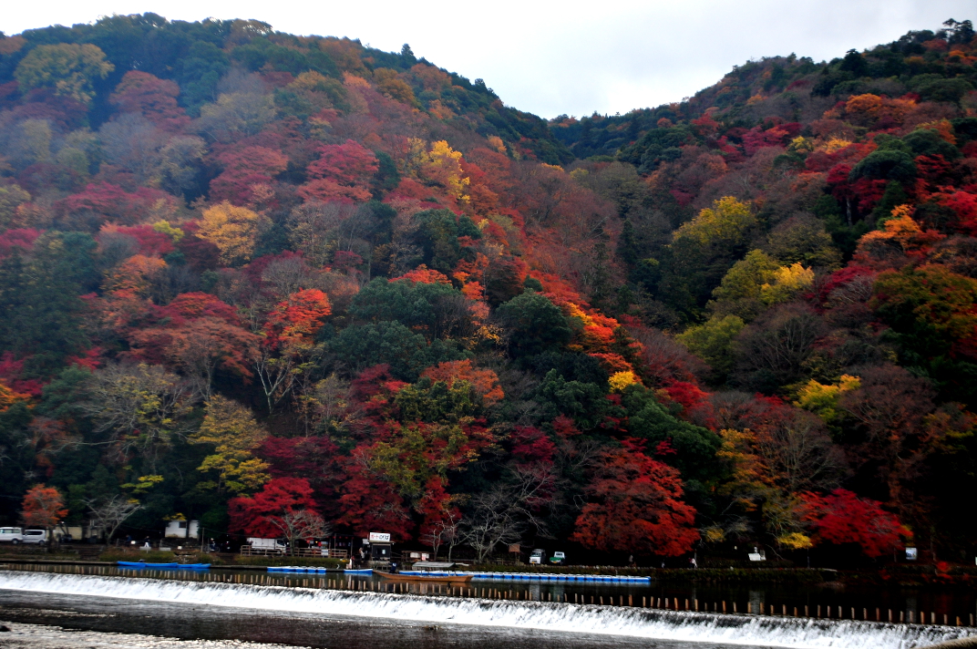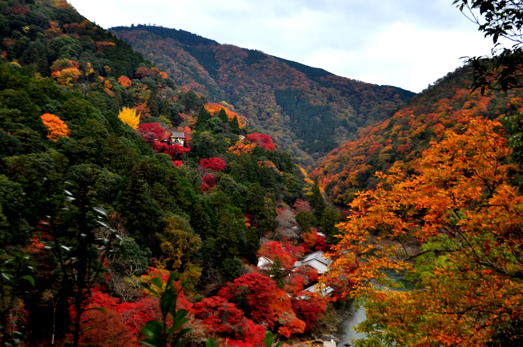 From there I headed down to the Togetsukyo Bridge to see the view around the river and the leaves adorning the mountains. What a sight it was to behold, a far cry from my first day in Kyoto fifteen months prior. The mountainside was a patchwork of reds, golds, yellows, browns, and oranges. With a number of red maples along the riverside walkways, it painted a fantastic picture. For the next couple of hours, I walked around various parts of the river I hadn’t seen on my first visit and just enjoyed the scenery. The views of valleys from the top of the walks were superb and offered many a photo opportunity. You could even see a temple nestled into the mountain on one side of the valley.