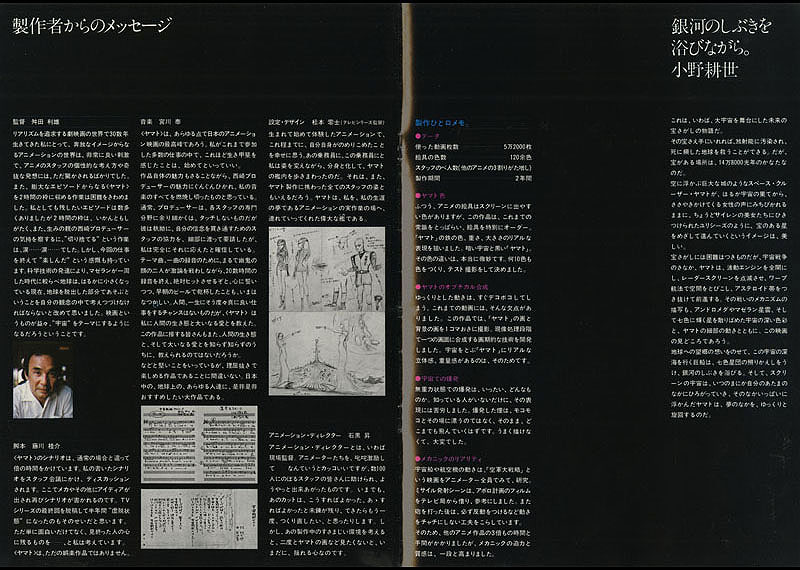 Producing an animated film–compared to live-action movies–is a continuation of hand-crafted manufacturing, which is unthinkable in this age of automation. The process is divided and subdivided into many phases, each one an essential part of the whole production. I would like to list some of those who I gathered together to bring Space Battleship Yamato to the big screen: