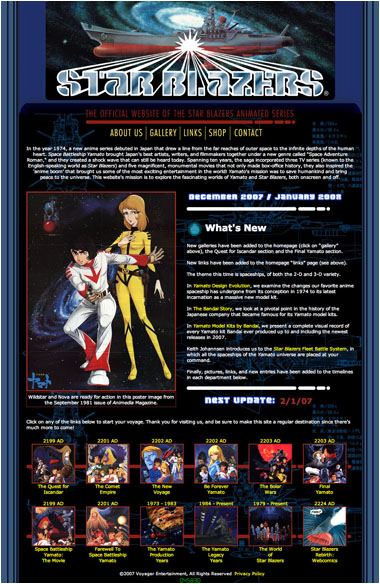 In 2000 I was approached by Voyager again and hired as a freelancer to help them convert their video line from VHS to DVD with all the trimmings. During the course of that very enjoyable project they decided to launch starblazers.com with me as the writer/editor, kicking off in the summer of 2002. Over its ten-year history, the site expanded far beyond anything any of us imagined at the start; hundreds of pages, thousands of readers, webcomics, travelogues, interviews, you name it. In late 2012 the home office of Voyager in Japan decided to take back the car keys and shut down the American operation. It would have been nice to get an explanation for this move, but none has been offered.