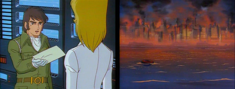 Kodai reaches a bombed-out airfield. A flying patrol ship does a sweep to destroy the few remaining Cosmo Tigers, forcing Kodai to run for his life. It’s in the aftermath of the attack that Kodai and Yuki meet up. After a quick embrace (complete with swelling, romantic music), Yuki reads the letter from Commander Todo. Kodai is to gather the Yamato crew and meet up with Sanada [Sandor] at the Icarus base. Yuki suggests going to Hero’s Hill to wait for the others. The Hill is often where the crew meets in times of trouble.