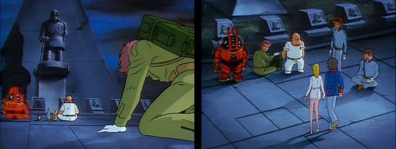 Kodai shows a video survey of the interior of the Mars base. The buildings are intact, but all personnel are dead, frozen in whatever position they were when the red beam struck. (During the clip, one of the paralyzed men falls off his seat, but somehow everyone else remains upright.) While he tries to maintain a formal tone, Kodai slips and addresses Mamoru as “brother,” which earns him a sharp rebuke.