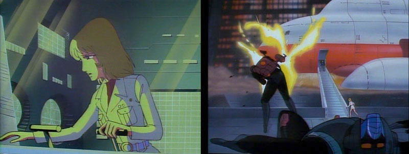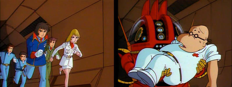 Earth Defense Forces command HQ in Megalopolis City (Japan) is in a panic. (Look for one poor guy who gets accidentally body-slammed in the hallway) In the nerve center we see two familiar faces: Yamato‘s communications man, Aihara [Homer], and Mamoru Kodai. When the UFO approaches Earth, defensive missiles prove ineffective and the object starts landing procedures. While average citizens panic, Dr. Sado [Dr. Sane] and Analyzer [IQ-9] take it all in stride. “Maybe they came to have some fun?” Dr. Sado suggests between sips of sake.