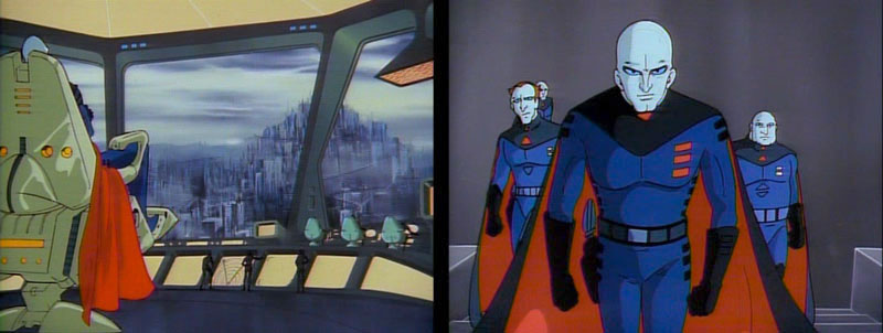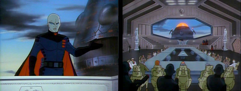 By morning, the fighting is over. Enemy troops and tanks stand guard beside the huge UFO. The Galiades and its escorts land and Kazan strolls into the Earth Federation conference room and declares that the planet now belongs to him. Like Alphon, the invasion forces wear capes, but their outfits’ dark coloring makes them less outlandish than the light-gray-and-white “super-hero” uniforms seen in The New Voyage.