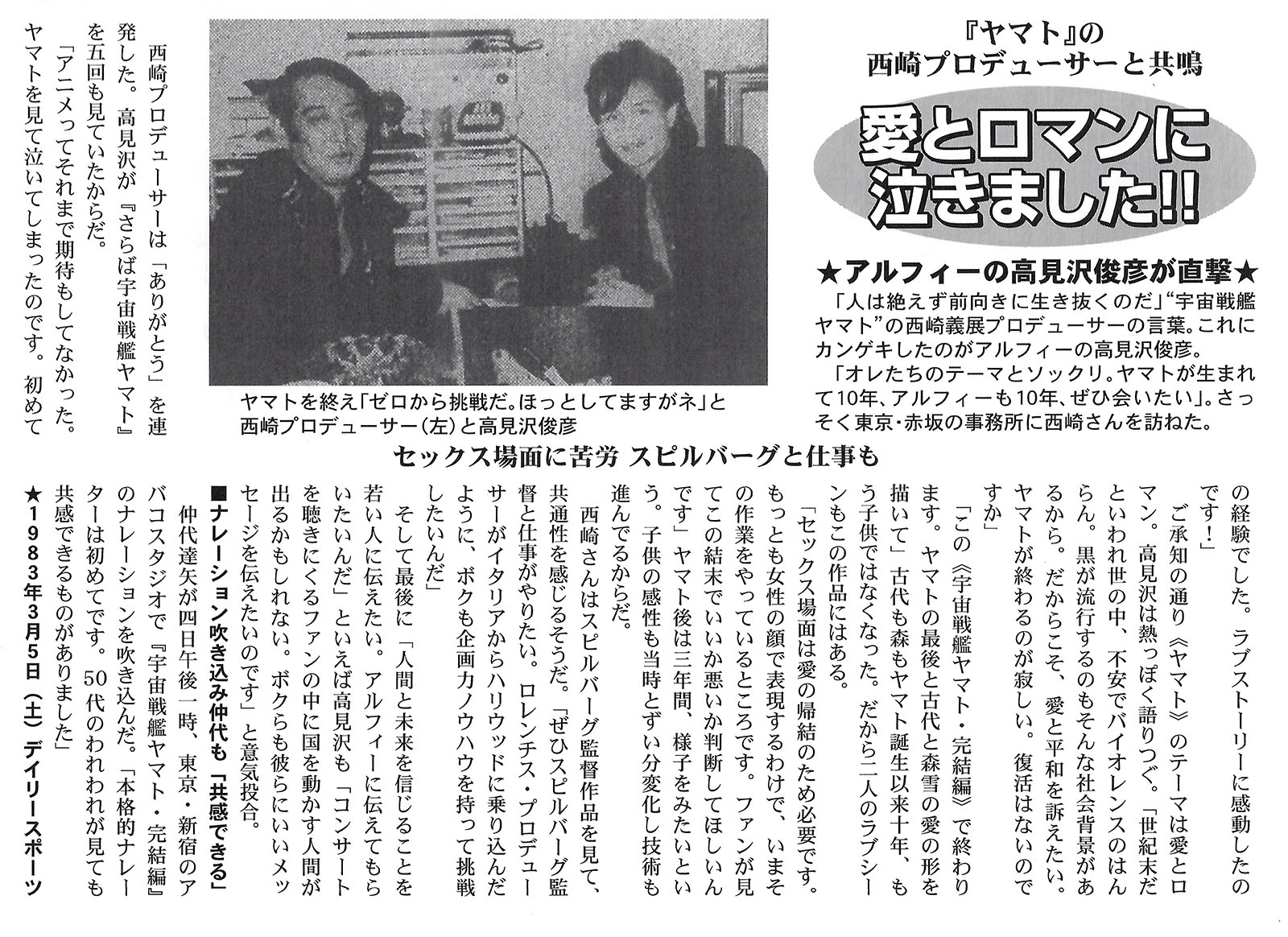“People should always live with a positive attitude,” said Yoshinobu Nishizaki, producer of Space Battleship Yamato. This made The Alfee’s Toshihiko Takamizawa very excited. “It’s exactly the same as our theme. It’s been 10 years since Yamato was born and 10 years since The Alfee was born, so I’d love to meet him,” I said. I immediately visited Nishizaki at his office in Akasaka, Tokyo.