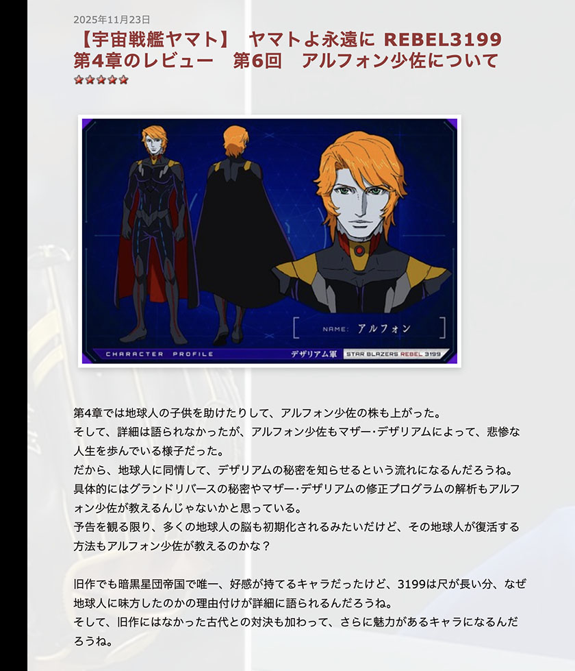 Also, since Gol Hainey’s death scene wasn’t clearly depicted, I personally think he might still be alive. As I’ve written many times, scenarios where someone dies just to tug at heartstrings feel outdated nowadays. I want Hainey to play the role of saving Sasha when she’s on the verge of death on Dezarium’s homeworld and delivering her to Dessler’s fleet. Then, Sasha could become Dessler’s wife, symbolizing the unification of Iscandar and the Galman-Garmillas Empire. I’m convinced Hainey is definitely alive and that there’s some kind of surprise in store.