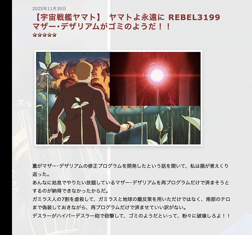 Furthermore, the Garmillans have accumulated deep-seated grudges against Dezarium since the original series, compounded by the massacre of 70% of the Garmillas people in 2205. When Yamato is surrounded by the Goruba fleet and faces a major crisis, I want a scene where the Galman-Garmillas Imperial Fleet led by Dessler appears, directs Yamato toward Dezarium’s homeworld, and then annihilates the remaining Goruba fleet with the Hyper Dessler Cannon.
