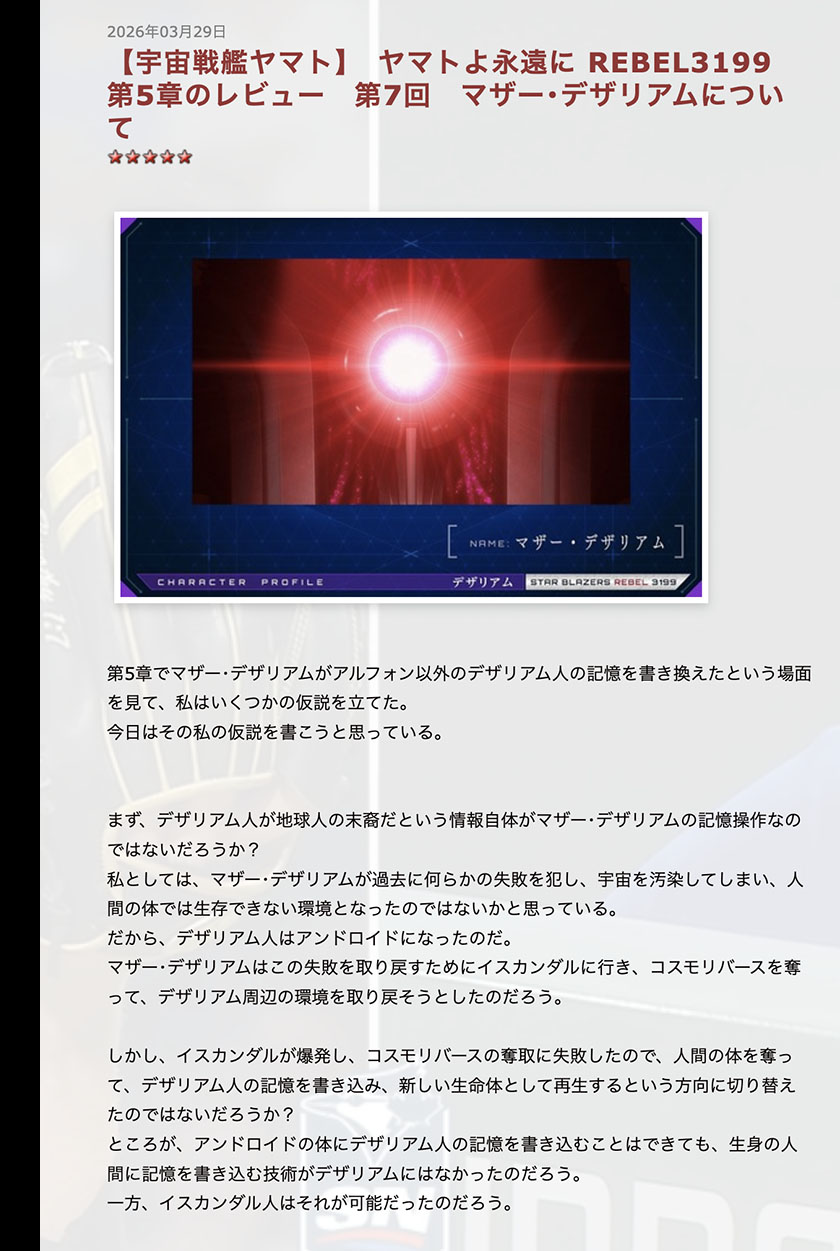 My personal theory is that, sometime in the past, Mother Dezarium committed a grave error that resulted in the contamination of the universe, creating an environment in which human bodies could no longer survive. That’s why the Dezarium people became androids. To rectify this failure, Mother Dezarium likely traveled to Iscandar to seize the Cosmo Reverse System, intending to restore the environment in the vicinity of Dezarium.