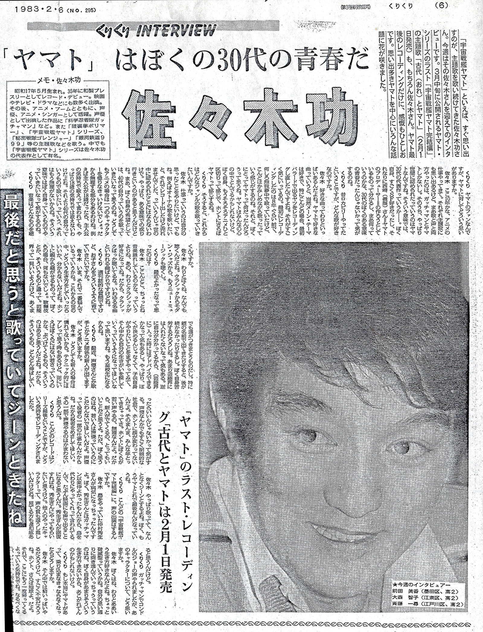 When we think of Space Battleship Yamato, the first person to come to mind is Isao Sasaki, who has been singing the theme songs for the series. This week, we have an interview with him. Of course, he sang the theme song Kodai [I] and Yamato for the final installment of the series, Space Battleship Yamato, The Final Chapter, which will be released in mid-March. Since this is his last recording for Yamato, the emotions are particularly strong. We had a lively discussion about various topics, centering on Yamato, which holds many memories for us.
