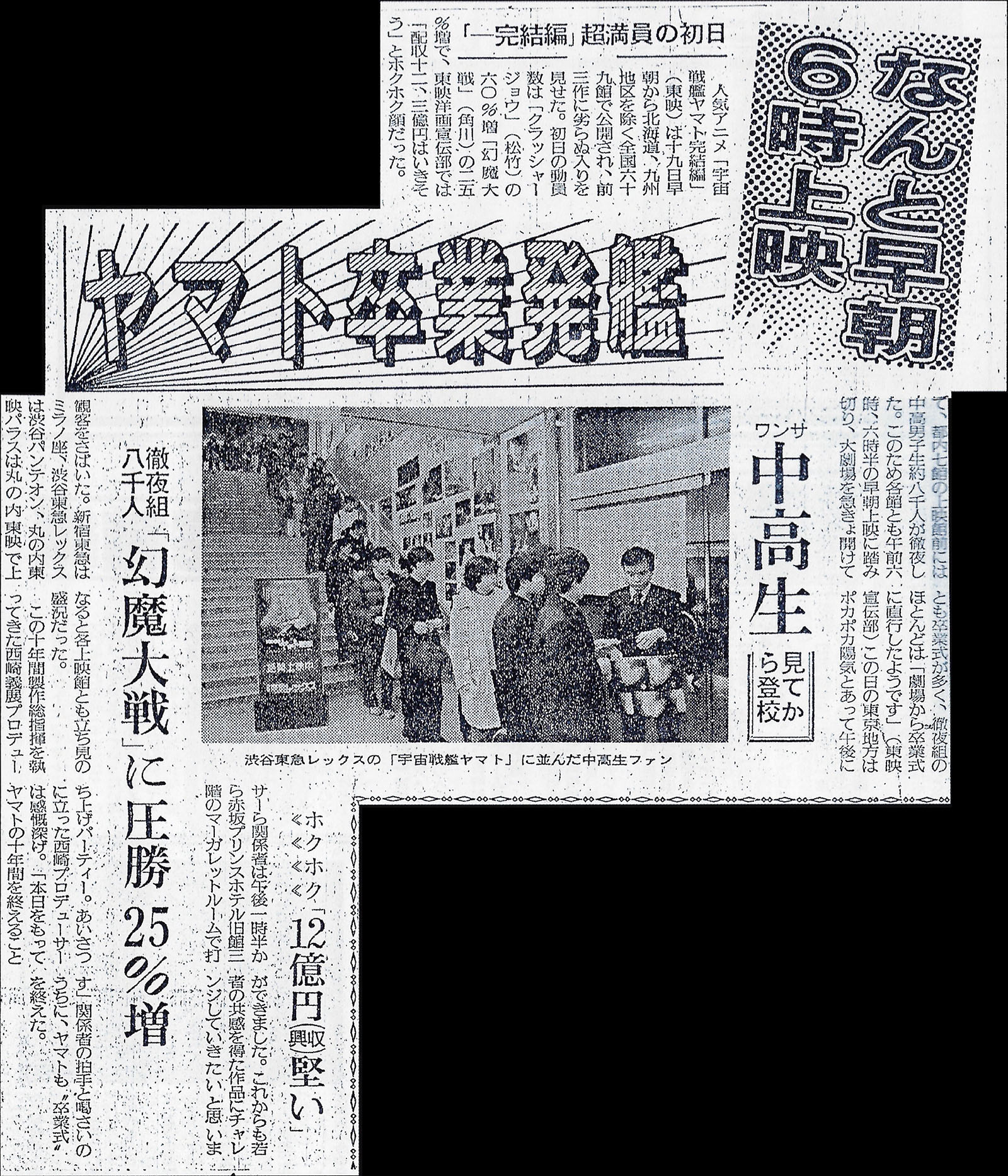 Whether you laugh or cry, this was the final Space Battleship Yamato, and around 8,000 middle and high school students stayed up all night in front of seven cinemas in Tokyo. As a result, each cinema decided to hold early screenings at 6am and 6:30am, and quickly expanded into their larger theaters to accommodate the audience. Shinjuku Tokyu screened the film at the Milano in Shinjuku, Shibuya Tokyu Rex expanded into the Shibuya Pantheon, and Marunouchi expanded into the Marunouchi Toei Palace to avoid overwhelming crowds.
