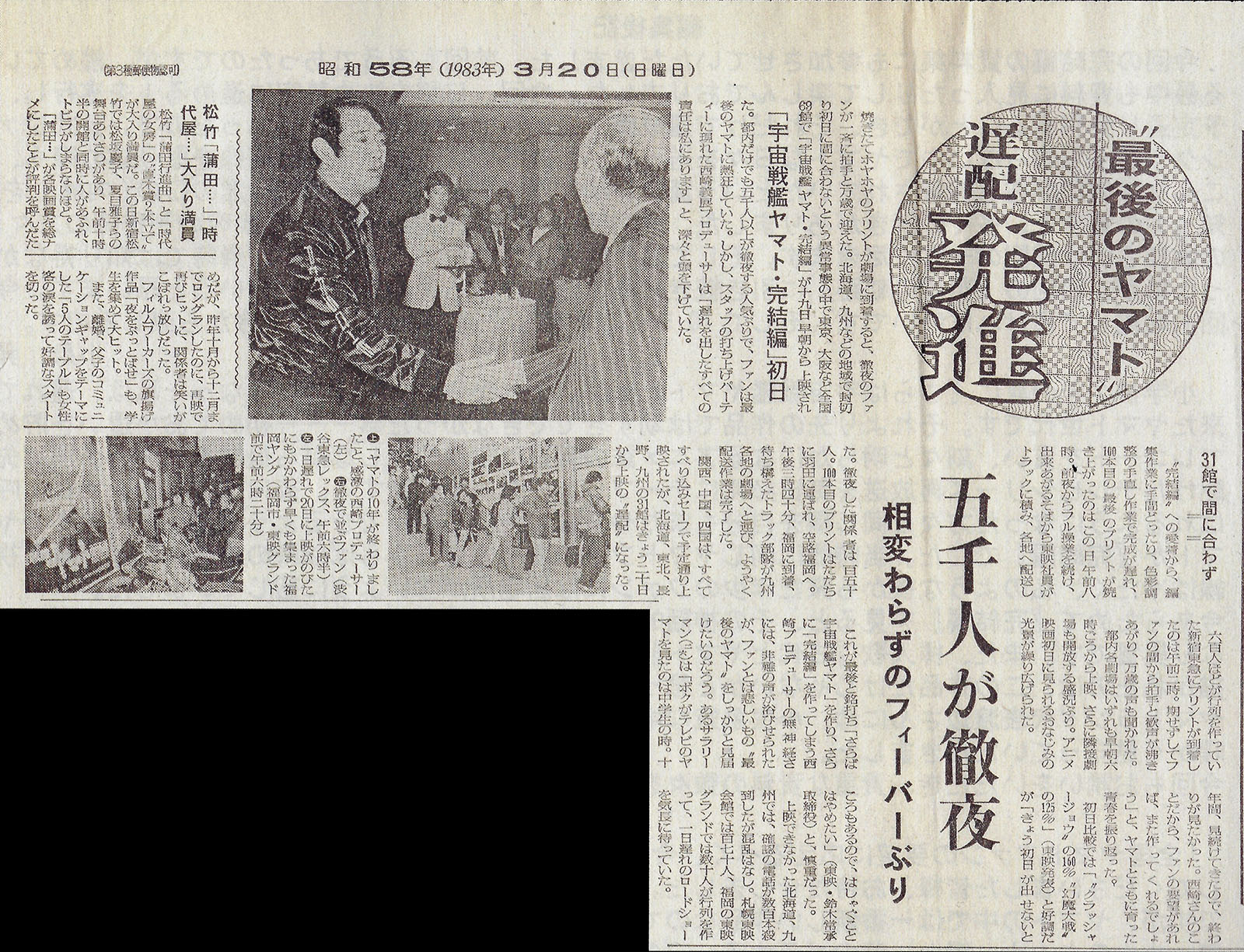 When the freshly-baked prints arrived at theaters, fans who had been up all night greeted them with applause and cheers. Despite the unusual situation of the film not being released on opening day in areas like Hokuriku, Hokkaido, and Kyushu, Space Battleship Yamato,The Final Chapter was screened in Tokyo, Osaka, and other areas from early on the 19th. In Tokyo alone, more than 50 people were singing along, and fans were going wild for the finale of Yamato. However, when Producer Yoshinobu Nishizaki appeared at the staff’s after-party, he bowed deeply and said, “I take full responsibility for the unrest.”