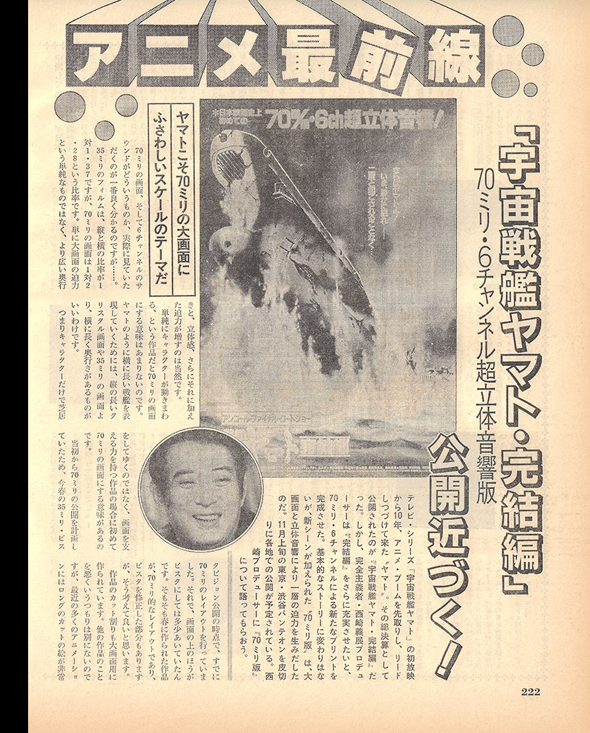 Ten years have passed since the initial broadcast of the TV series Space Battleship Yamato, a franchise that not only anticipated the anime boom but has continued to lead it ever since. The film Space Battleship Yamato, The Final Chapter was released as the grand culmination of this saga. However, the perfectionist producer Yoshinobu Nishizaki sought to further enrich The Final Chapter, ultimately completing a new print utilizing 70mm film and 6-channel sound. While the fundamental storyline remains unchanged, this “70mm Edition,” featuring newly-added scenes and harnesses the power of a massive screen and stereophonic sound to generate an even greater sense of intensity. Screenings are scheduled to take place across the country, beginning in early November at the Shibuya Pantheon in Tokyo. Let us now hear from Producer Nishizaki as he discusses this “70mm Edition.”