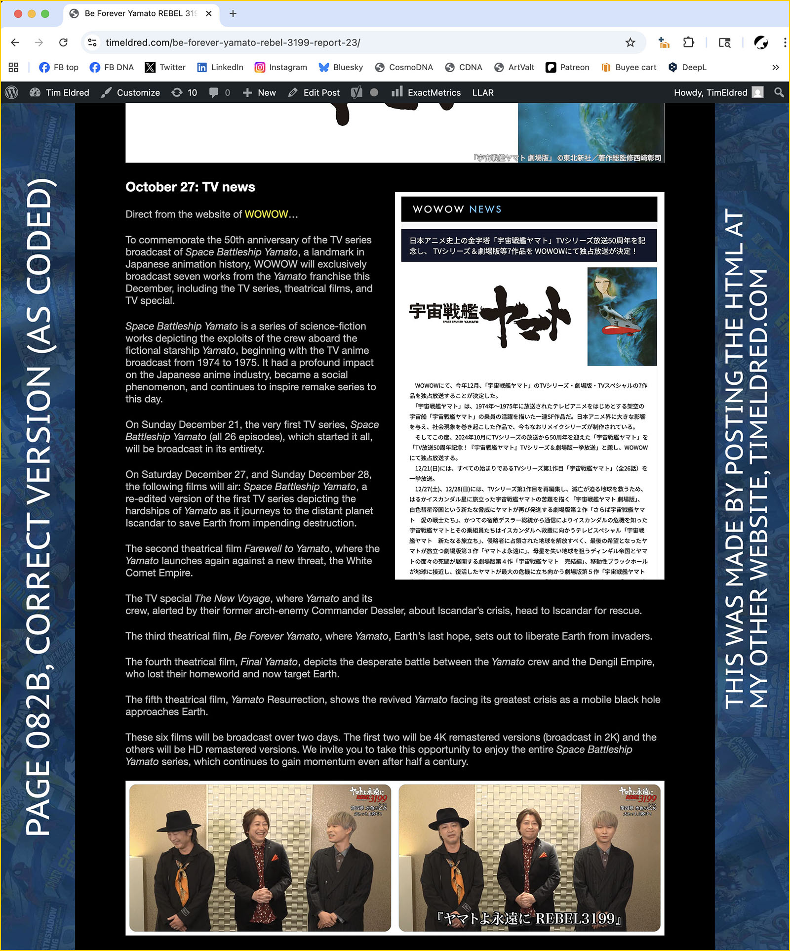 I recreated the second version (below) by pasting the same HTML into my other website (timeldred.com) which uses almost the same CSS. Right away, you can see an H3 headline under the image and the correct font in the body text. I regularly code H2 and H3 headlines, but they’re not currently displaying that way.