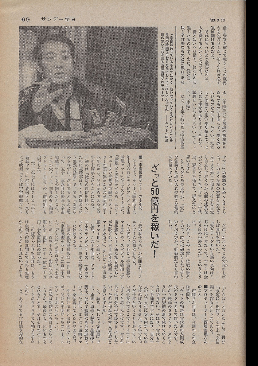 Becoming Osamu Tezuka’s general manager led to his encountered with animation, and in 1970 he founded Academy Co. Ltd. Prior to the TV anime Space Battleship Yamato, he produced two other series, but they were completely unsuccessful. Yamato also initially flopped, but it later became a huge hit, apparently because its popularity had been gradually building up overtime.