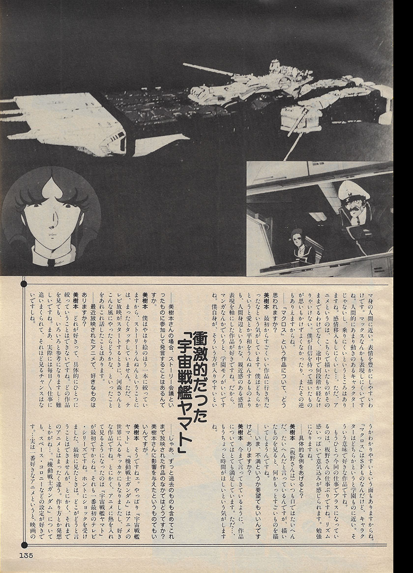 Mikimoto: Space Battleship Yamato and Mobile Suit Gundam were the ones who that got me into the world of anime, and they’re two of my favorite works. It was Yamato that got me into watching anime with such enthusiasm. It was the very first TV series. I was really shocked when I first saw it. I can’t really say what it was about it, but it was completely different from any anime that had come before. The way it was made, the ideas, etc.