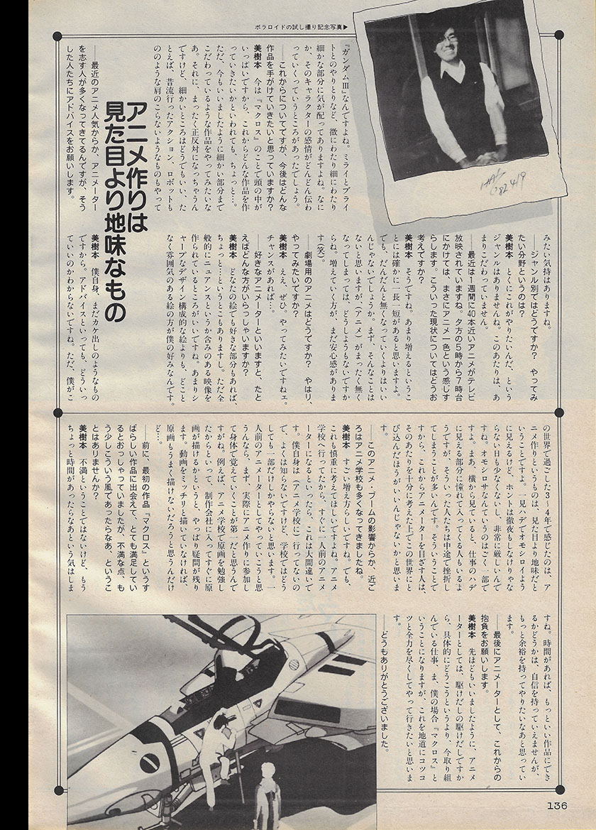 Haruhiko Mikimoto, who has been attracting attention as the animation director of Super Dimension Fortress Macross, is a young animator who is still only 23 years old. He is also a unique animator, having graduated from the faculty of engineering at Keio University. We asked him some questions, focusing on Macross, which he said he was “blessed with from the very beginning.“