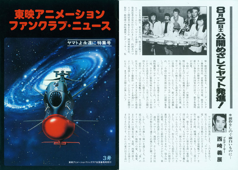 Approximately 200 media people gathered there with Toei President Shigeru Okada, Executive Producer Yoshinobu Nishizaki, Art Director Leiji Matsumoto, Composer Hiroshi Miyagawa, and Chief Director Tomoharu Katsumata. Also in attendance was the familiar singer Isao Sasaki, and songwriter Yoko Yamaguchi & writer/singer Akira Fuse, who are participating for the first time.