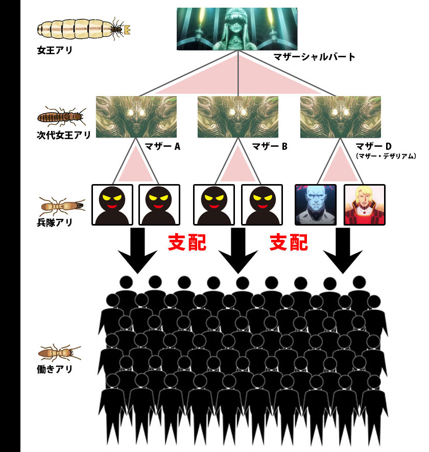 First, Shalbart as the absolute ruler, the “Queen Ant,” reign at the top of the pyramid. Below her, the Shalbarts’ kin (presumably their daughters?) are dispatched to each galaxy in positions similar to governors. This is the entity referred to as “Mother.”