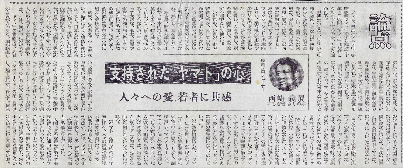 I may be bragging a little, but I believe Yamato further sparked the quantitative development of animation since Astro Boy. However, there are many producers and animators who do not understand the true essence of animation. It is even harmful for such people to allow the proliferation of inferior products. It seems to me that the anime industry is nearing a turning point.